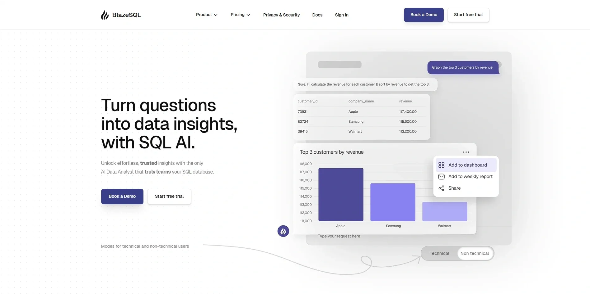 BlazeSQL converts plain English questions into SQL queries instantly and then visualizes the results. It is fast, clean, and very beginner-friendly.