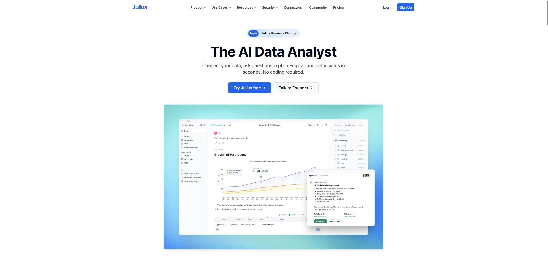 - Key features: Natural language querying, auto chart generation, code-free analysis