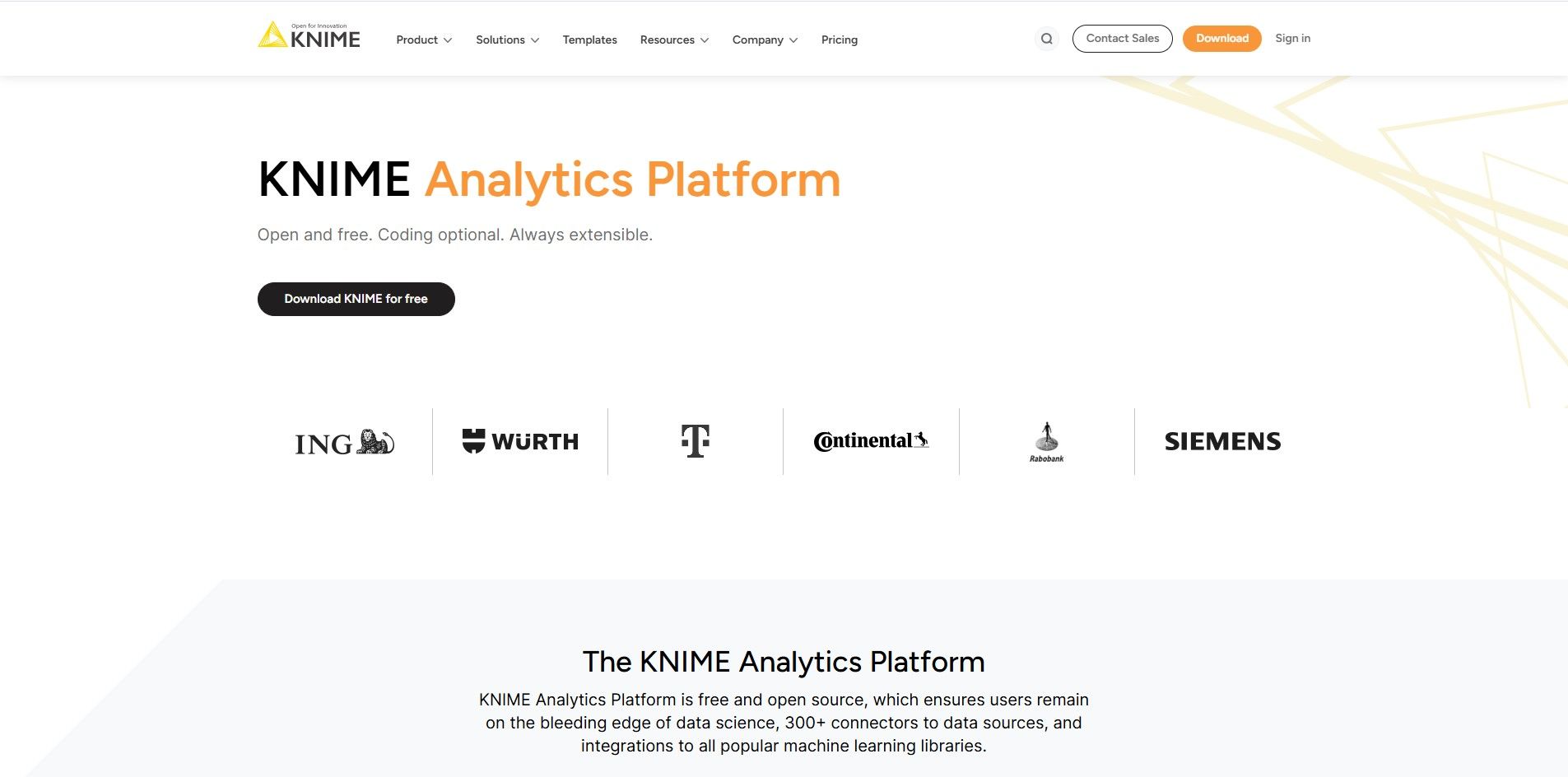 - Key features: Visual workflow builder, 2,000+ built-in analytics components, Python/R integration
