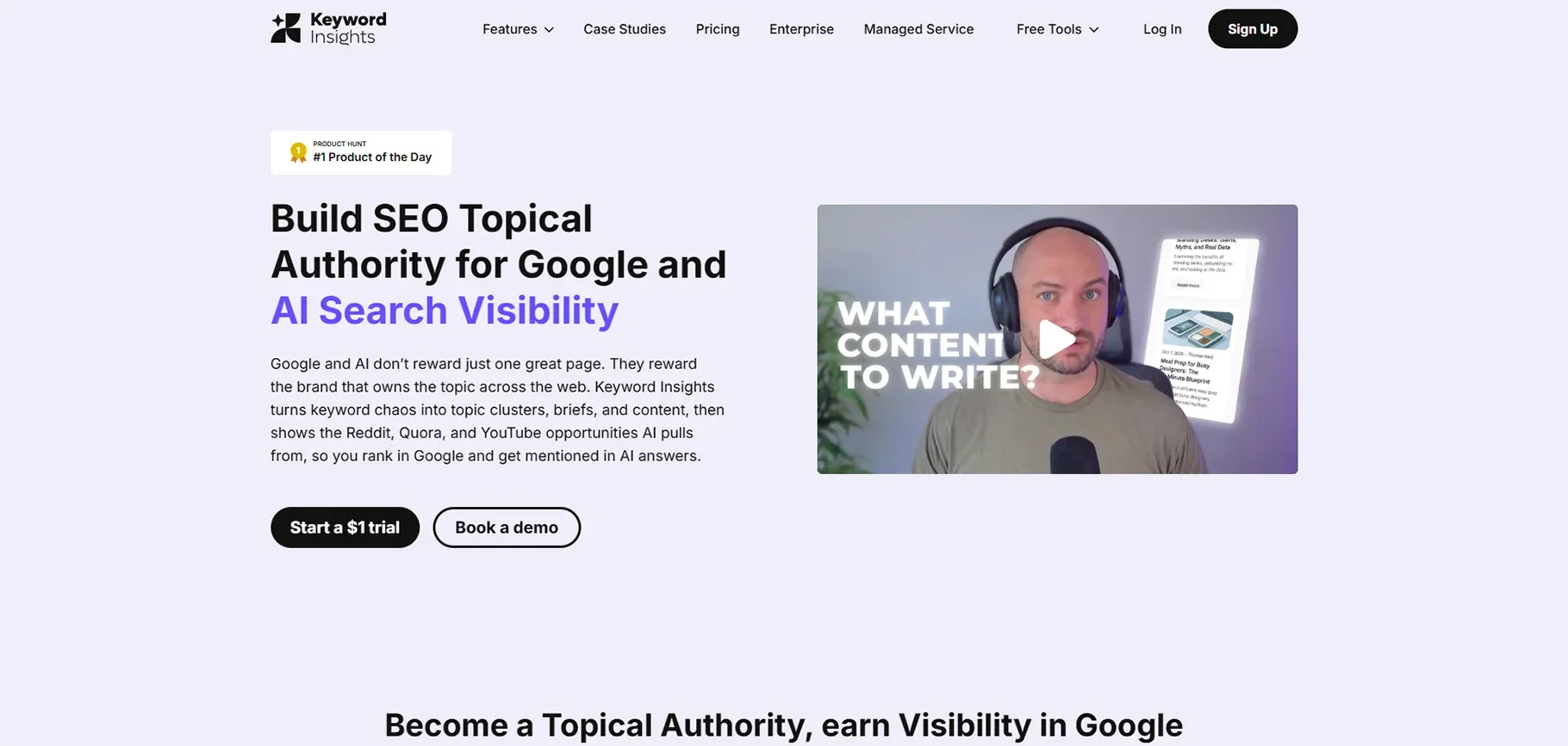 Keyword Insights is the best AI SEO tool for content strategy because it clusters keywords based on SERP similarity and search intent, helping prevent keyword cannibalization and improve topical authority.
