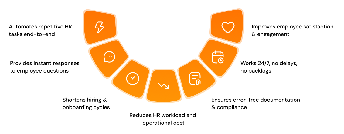 With an AI-powered HR agent, you automate routine HR tasks, speed up hiring, and improve employee support, saving time, reducing costs, and boosting overall HR efficiency